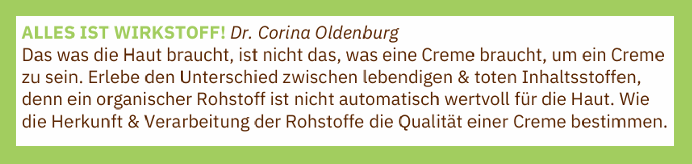 Dr. Oldenburg Naturkosmetik garantiert jedoch genau das: Alles ist Wirkstoff! Erfahre mehr am 26. April bei dem spannenden Vortrag von Dr. Corina Oldenburg.